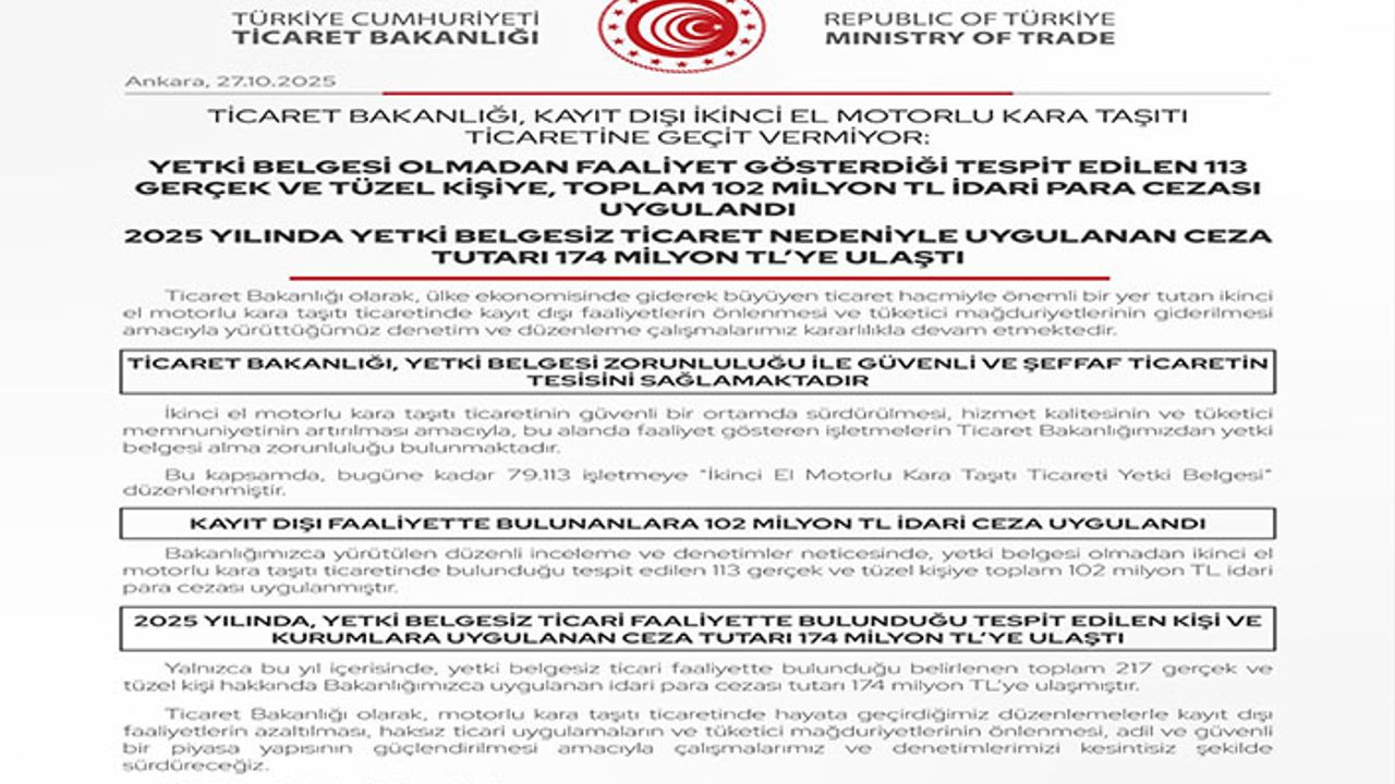 Ticaret Bakanlığı tarafından kayıt dışı ikinci el motorlu kara taşıtı ticaretine yönelik çalışmalar sürüyor. Bu kapsamda yetki belgesi olmadan faaliyet gösterdiği tespit edilen 113 gerçek ve tüzel kişiye, toplam 102 milyon lira idari para cezası uygulandı. 2025 yılında yetki belgesiz ticaret nedeniyle uygulanan ceza Tutarı 174 milyon liraya ulaştı.