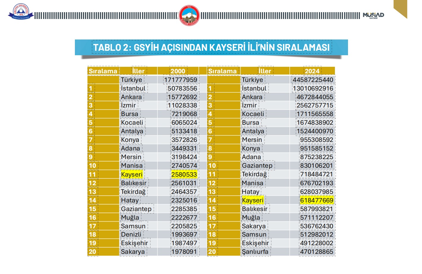 Rapora göre; Gayri Safi Yurtiçi Hasıla(GSYH), iller sıralamasına ilişkin verilerde Kayseri, 2000 yılında 11’nci sıradayken 2024 yılında 14’ncü sıraya gerilediği görülmekte. Kayseri, 2000 yılında 2 milyon 580 bin 533 TL GSYİH’e sahipken 2024 yılında bu rakam 618 milyon 477 bin 669 TL oldu. GSYH’nin 24 yıllık değişiminin yer aldığı göstergelerde, Kayseri sıralamada herhangi bir ili geçmezken, Tekirdağ, Hatay ve Gaziantep sıralamada Kayseri’nin üzerine çıkan iller oldu.