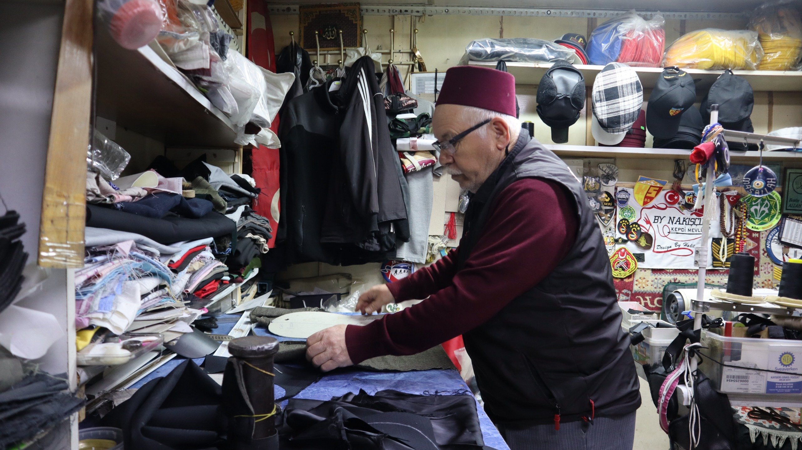 Kayseri’de yaşayan Mevlüt Tarcan, ilkokulu tamamladıktan sonra 1967 yılında çırak olarak adım attığı şapkacılık mesleğinde 59’uncu yılını geride bıraktı. Ustasının yanında yetişen, zamanla kendi atölyesini kurarak üretimini büyüten Tarcan, Argıncık’ta üç katlı atölyede askeriyeye kep ve arma üretimi yaptı. Çocuklarının da bir dönem hem okuyup hem çalıştığı atölyede mesleğini sürdüren Tarcan, bugün Kapalıçarşı Kürkçüler Sokak’ta faaliyet gösteriyor. Kentte “Kepçi Mevlüt” olarak tanınan 3 çocuk babası Tarcan, mesleğin son temsilcilerinden biri olarak çalışmalarına devam ediyor. Mesleğe başlama sürecini anlatan Tarcan, “İlkokulu köyümde bitirdim ve 1967’de sanata geldim. Ustam Mehmet Batır’dı, Allah rahmet eylesin. Onun yanında yetiştim. Şapka ile başladık, sonradan askeriyeye kep ve arma yaptım. Nakış makinelerimiz vardı, Argıncık’ta 3 katlı atölyem vardı. Çocuklarım hem okudu hem çalıştı. Şimdi biri muhasebeci, biri Erciyes Üniversitesi makine bölümünden mezun oldu ve organize sanayide makine mühendisi olarak çalışıyor. Ben de burada kendi işimi yapıyorum. Fes, kep, şapka, tamir, tadilat, kostüm. Bende çeşit çok. Hacivat Karagöz şapkası yapan yok Kayseri’de, ben yapıyorum. Tiyatrodan geliyorlar. Geçenlerde Kayseri tiyatrosunun ‘Şoför Nebahat’ oyunu için şapka yaptım. Bana bir resim gösterin, ‘şundan istiyorum’ deyin, yaparım” dedi.
