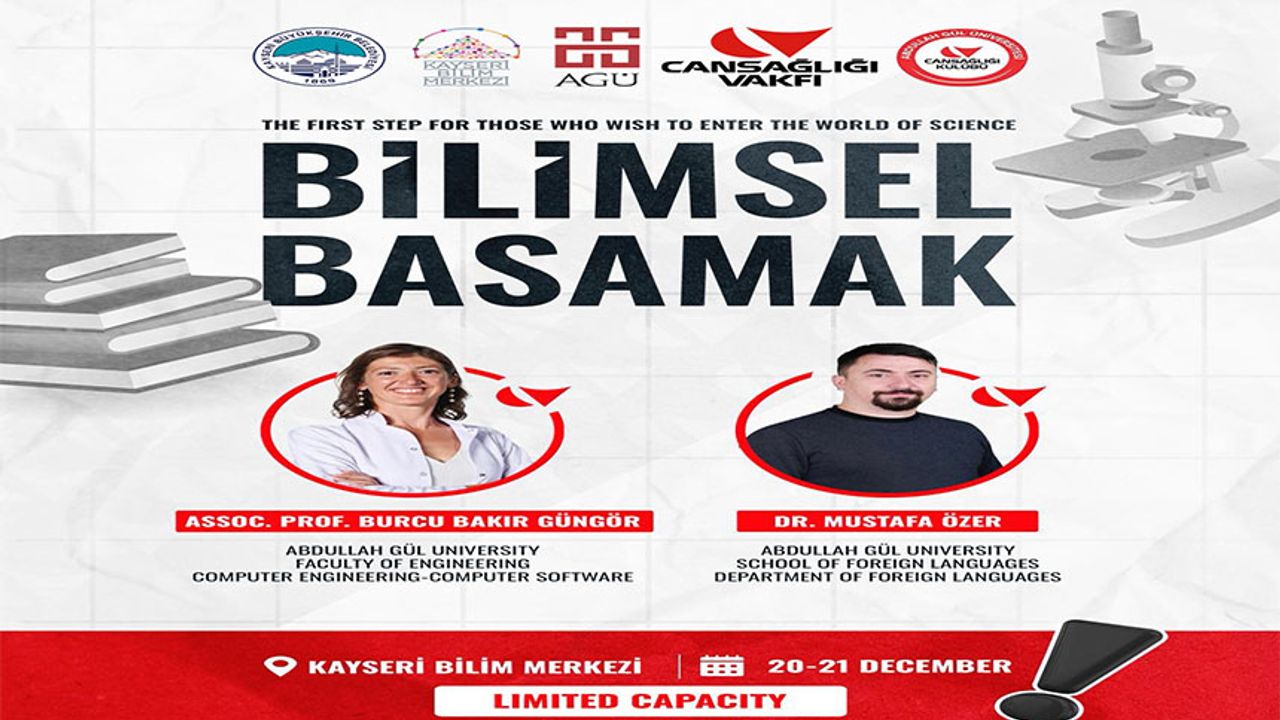 Kayseri Bilim Merkezi ev sahipliğinde, Kayseri Büyükşehir Belediyesi, Abdullah Gül Üniversitesi (AGÜ), Cansağlığı Vakfı ve AGÜ Cansağlığı Kulübü iş birliğiyle 20-21 Aralık 2025 tarihlerinde “Bilimsel Basamak Eğitimi” düzenlenecek. Program, sağlık alanındaki lisans, lisansüstü öğrencileri ve bu alanda profesyonel olarak çalışan bireyler için özel olarak tasarlandı. Katılımcılar, bilimsel araştırma yöntemleri ve akademik yazım konusunda derinlemesine bilgi sahibi olma fırsatına sahip olacak.