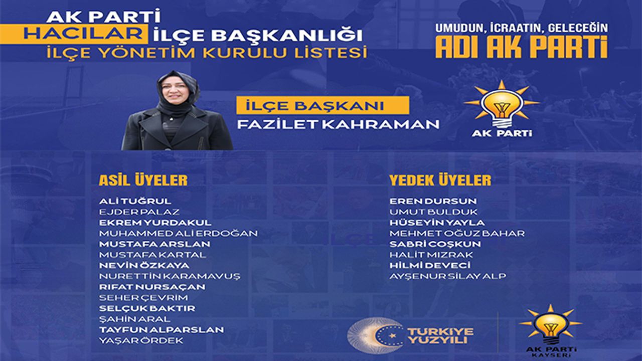 Adalet ve Kalkınma Partisi (AK Parti) Hacılar İlçe Başkanlığı görevine getirilen Fazilet Kahraman’ın yönetim kurulu belli oldu.