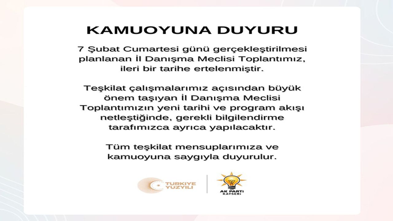 AK Parti Kayseri İl Başkanlığı tarafından 7 Şubat Cumartesi günü gerçekleştirilmesi planlanan İl Danışma Meclisi toplantısının ileri bir tarihe ertelendiği duyuruldu.