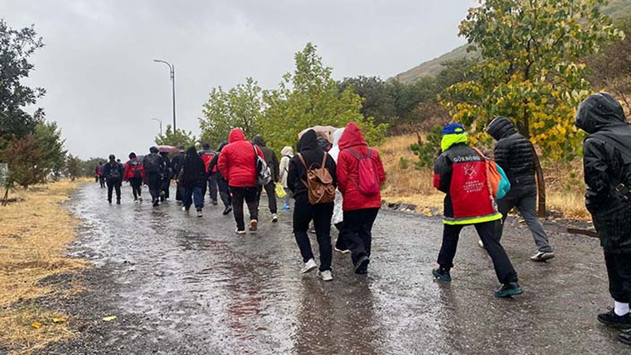 yağmur altında Ali Dağı turu yapan dernek mensupları, birlik ve beraberlik mesajı verdi.