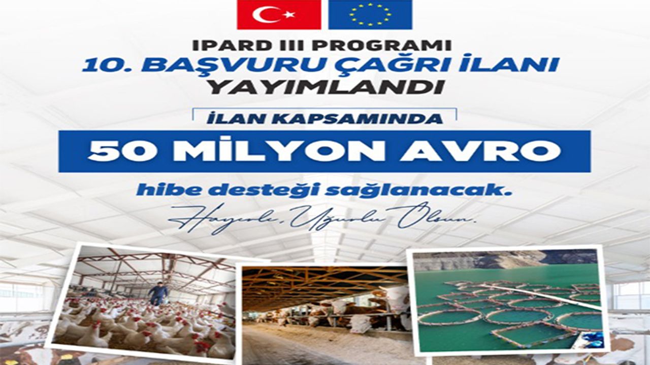 Tarım ve Orman Bakanı İbrahim Yumaklı IPARD III Programı Onuncu Başvuru Çağrı İlanı’nın yayımlandığını duyurdu. Bakan Yumaklı: “Kırsala bereket, girişimcilerimize güç olmaya devam ediyoruz. 81 ildeki girişimcilere yönelik, 50 milyon avro bütçeli IPARD III Programı Onuncu Başvuru Çağrı İlanı bugün yayımlandı. Yeni çağrı ilanımız kırsaldaki tüm girişimcilerimize hayırlı ve uğurlu olsun” ifadelerini kullandı. IPARD III Programı kapsamında, tarım ve kırsal kalkınma alanında faaliyet gösteren girişimcilere mali destek sağlanarak üretim kapasitesinin artırılması, istihdamın geliştirilmesi ve sürdürülebilir kalkınmaya katkı sunulması hedefleniyor.