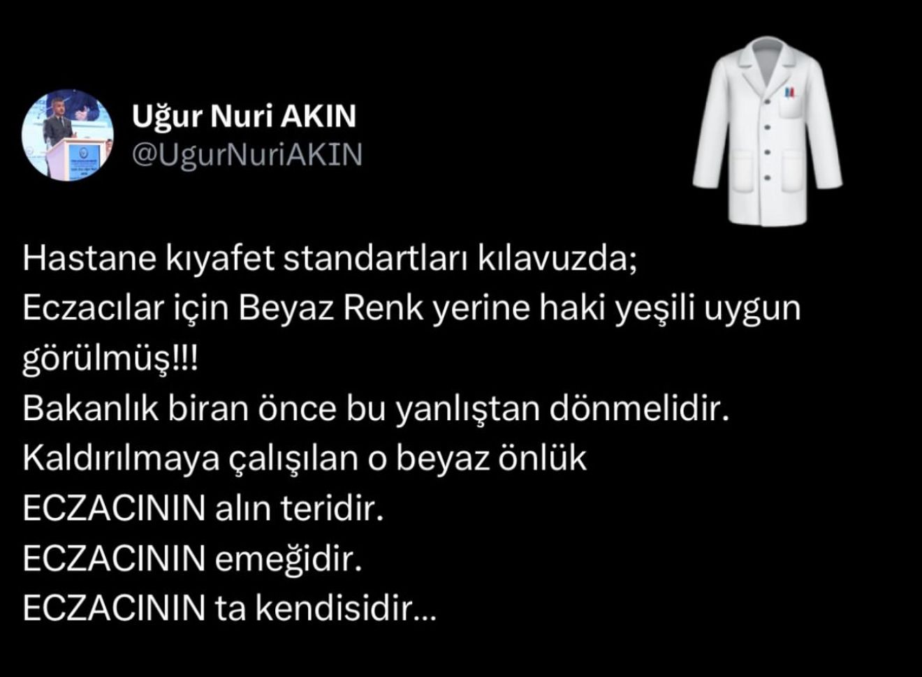 Kayseri Eczacı Odası Başkanı Uğur Nuri Akın, Sağlık Bakanlığı tarafından Türkiye genelinde görev yapan sağlık personelleri için tek tip kıyafet uygulaması ile ilgili eczacıların önlüğünün renginin haki yeşili olacağına ilişkin yaptığı eleştiride, “Hastane kıyafet standartları kılavuzda; Eczacılar için Beyaz Renk yerine haki yeşili uygun görülmüş. Bakanlık biran önce bu yanlıştan dönmelidir. Kaldırılmaya çalışılan o beyaz önlük eczacının alın teridir. Eczacının emeğidir. Eczacının ta kendisidir” ifadelerini kullandı.