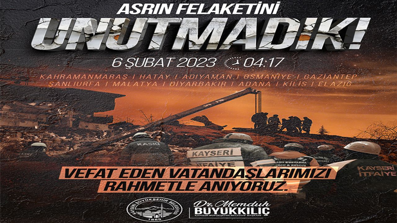 “Yaşadıklarımız asrın felaketiydi. 120 bin kilometre karelik alanda 11 ilimiz, 124 ilçemiz, 6 bin 929 köy ve mahallemiz ağır yıkıma uğradı. 53 bini aşkın canımızı yitirdik, 107 binden fazla vatandaşımız yaralandı. Bu büyük imtihanda kaybettiğimiz canlarımızı rahmetle anıyor, geride kalan tüm kardeşlerimize sabır ve metanet diliyorum. Rabbim, milletimizi her türlü afetten muhafaza etsin. Depremden etkilenen tüm vatandaşlarımıza bir kez daha geçmiş olsun dileklerimizi iletiyor, yaraların sarılması ve hayatın yeniden inşa edilmesi sürecinde dayanışma ve kardeşlik ruhuyla her zaman yanlarında olduğumuzu vurguluyoruz. Kayseri, dün olduğu gibi bugün ve yarın da dayanışmanın, merhametin ve kardeşliğin güçlü bir sembolü olmaya devam edecektir.”