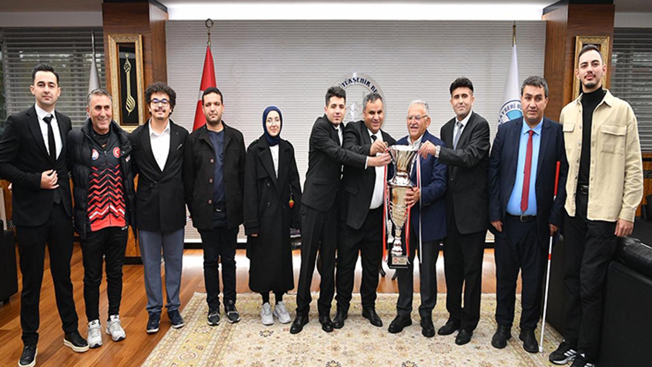Kayseri Büyükşehir Belediye Başkanı Dr. Memduh Büyükkılıç, Sesi Görenler 1. Ligi’nde şampiyonluğa ulaşan Kayseri Görme Engelliler Spor Kulübü’nü makamında ağırladı. Başkan Büyükkılıç’a şampiyonluk kupası, takım tarafından sunuldu.