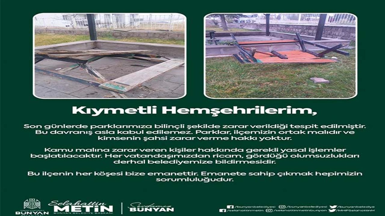 Bünyan Belediye Başkanı Selahattin Metin, “Son günlerde parklarımıza bilinçli şekilde zarar verildiği tespit edilmiştir. Kamu malına zarar veren kişiler hakkında gerekli yasal işlemler başlatılacaktır. Her vatandaşımızdan ricam, gördüğü olumsuzlukları derhal belediyemize bildirmesidir” dedi.