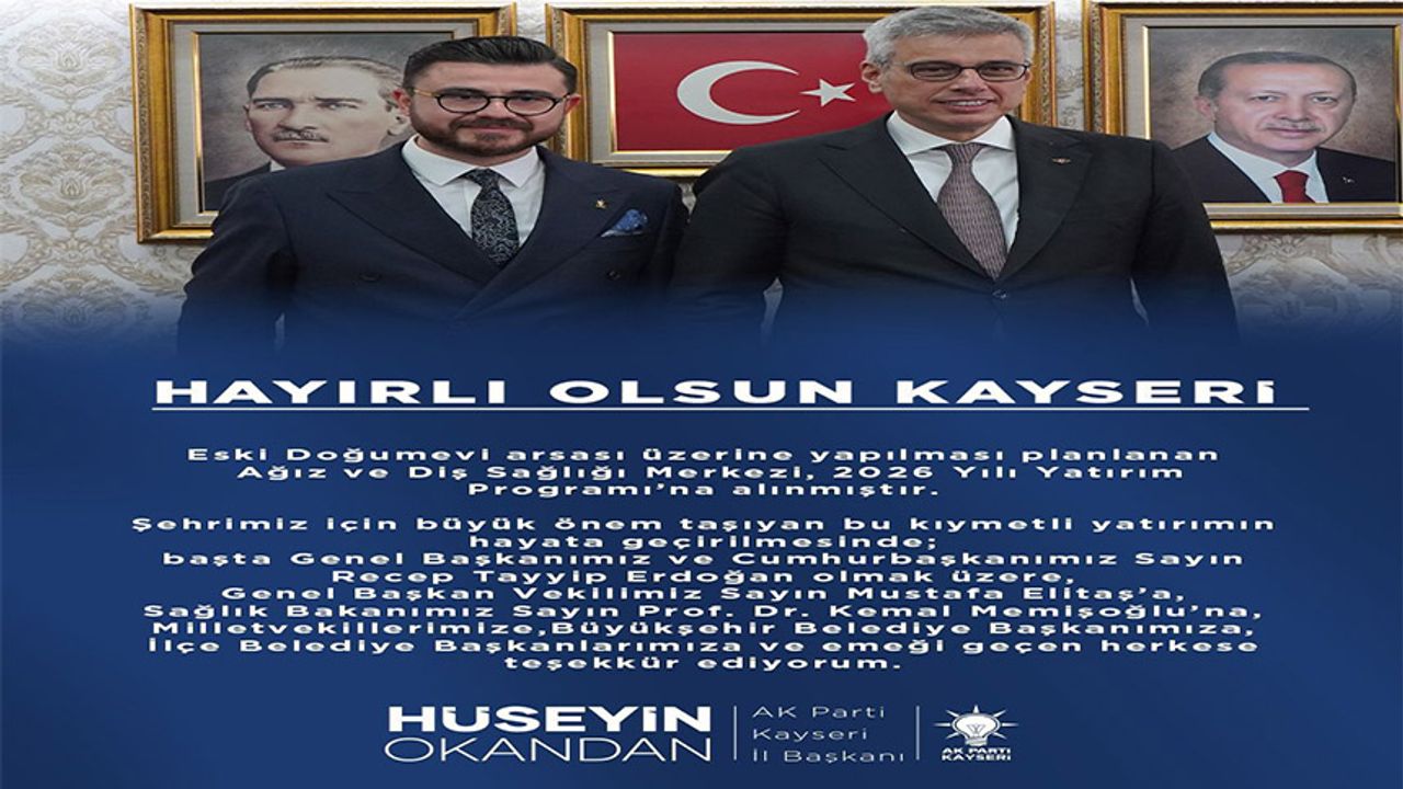 AK Parti Kayseri İl Başkanı Hüseyin Okandan, “Eski Doğumevi arsası üzerine yapılması planlanan Ağız ve Diş Sağlığı Merkezi, 2026 Yılı Yatırım Programı’na alınmıştır” dedi.