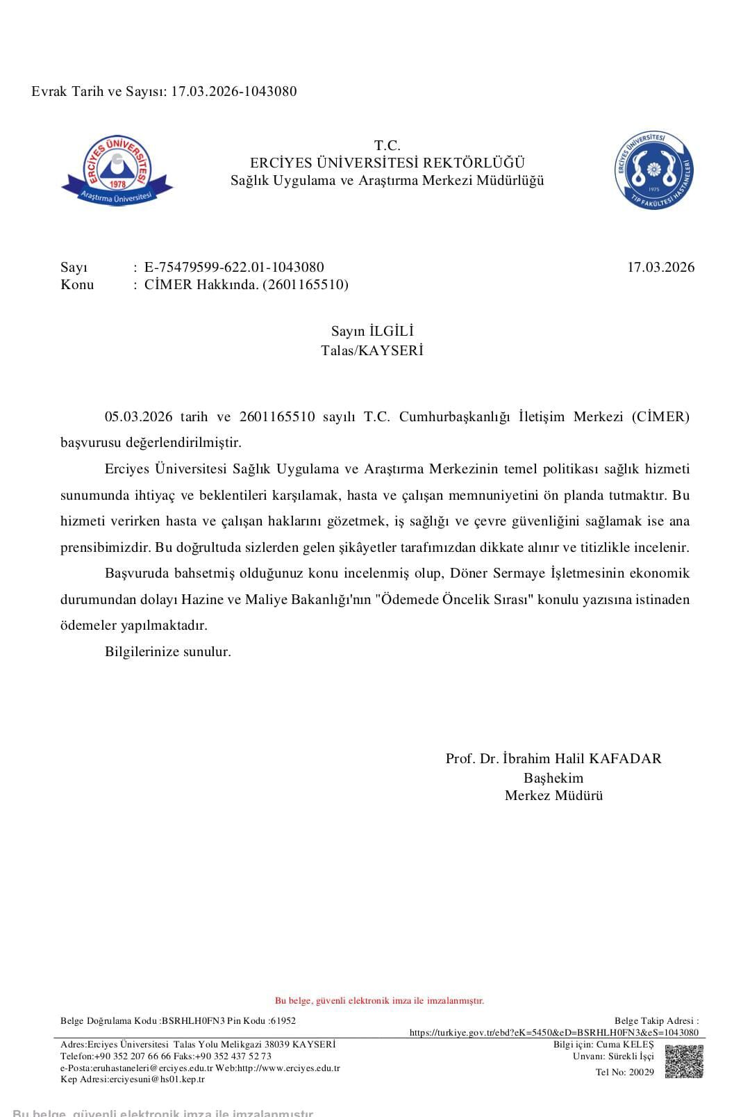 Başhekim İbrahim Halil Kafadar imzasıyla verilen yanıtta, 05.03.2026 tarihli başvurunun değerlendirildiği belirtilerek, ödemelerin Hazine ve Maliye Bakanlığı tarafından belirlenen “ödemede öncelik sırası” çerçevesinde gerçekleştirildiği ifade edildi.