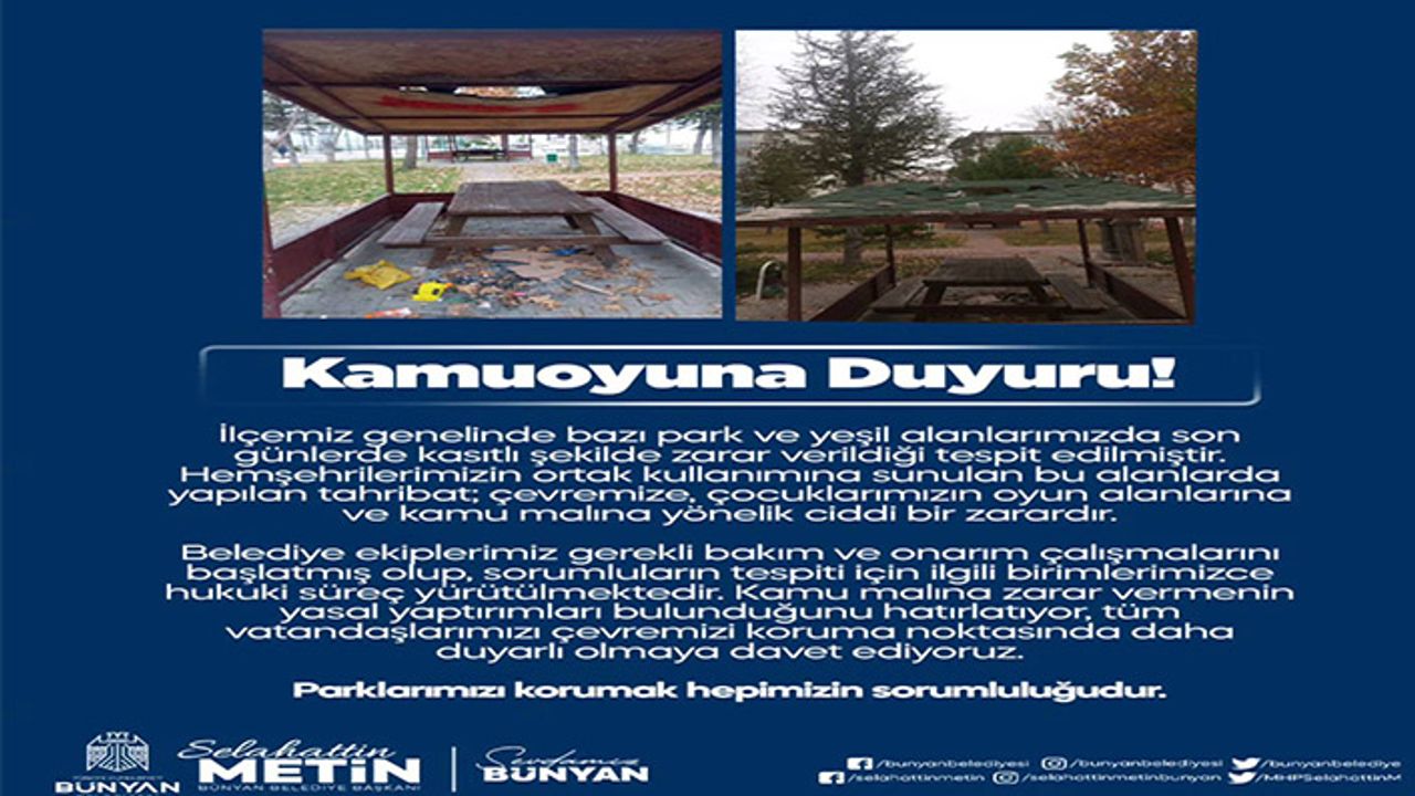 Bünyan Belediyesi tarafından yapılan duyuruda, ilçe genelinde park ve yeşil alanlara kasıtlı olarak zarar verildiğini gereken hukuki işlemlerin başlatıldığı belirtilerek; “Kamu malına zarar vermenin yasal yaptırımları bulunduğunu hatırlatıyor, tüm vatandaşlarımızı çevremizi koruma noktasında daha duyarlı olmaya davet ediyoruz. Parklarımızı korumak hepimizin sorumluluğudur” denildi.