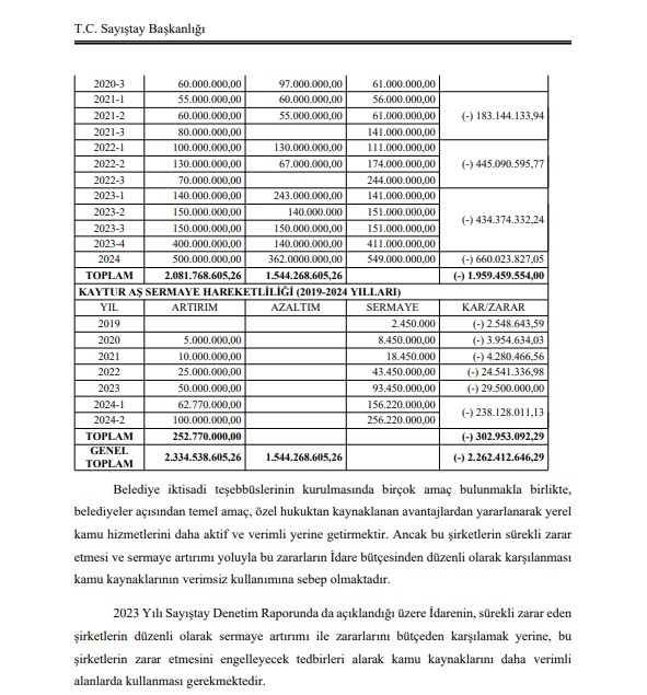 Büyükşehir Belediyesi iştirakleri olan Ulaşım A.Ş. ve Kaytur A.Ş.’nin her yıl ciddi miktarlarda zarar ettiği Sayıştay raporlarında ortaya çıktı. Söz konusu zararın 2019-2024 yılları arasında toplamda 2.262.412.646,29(2 milyar 262 milyon 412 bin 646) lira olduğu ifade edildi.
