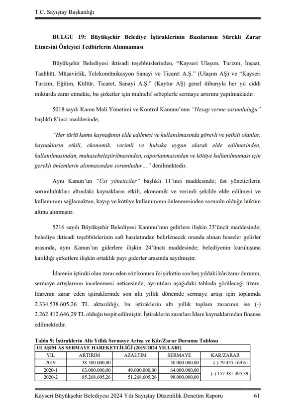 Büyükşehir Belediyesi iştirakleri olan Ulaşım A.Ş. ve Kaytur A.Ş.’nin her yıl ciddi miktarlarda zarar ettiği Sayıştay raporlarında ortaya çıkarken söz konusu raporda Sayıştay, şirketlerin düzenli olarak sermaye artırımı yapılarak zararlarının idare bütçesinden karşılanmasını “kamu kaynaklarının verimsiz kullanımına sebep olmaktadır” ifadeleri ile değerlendirildi.