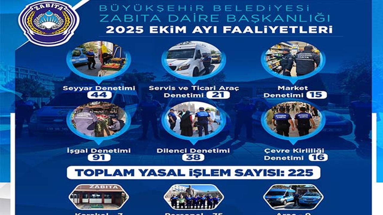 Zabıta ekipleri, şehir düzenini ve vatandaşların huzurunu korumak amacıyla seyyar satıcılardan ticari araçlara, çevre kirliliğinden dilencilere kadar geniş bir alanda denetim gerçekleştirdi. Ekim ayı boyunca yürütülen çalışmalar kapsamında, 44 seyyar satıcı, 21 servis ve ticari araç, 15 market ve 91 işgal olayı denetlendi. Ayrıca, 38 dilenciye yönelik işlem yapılırken, çevre kirliliği ile ilgili 16 denetim gerçekleştirildi. Toplamda 225 yasal işlem uygulanarak şehirde düzenin sağlanmasına katkı sunuldu.