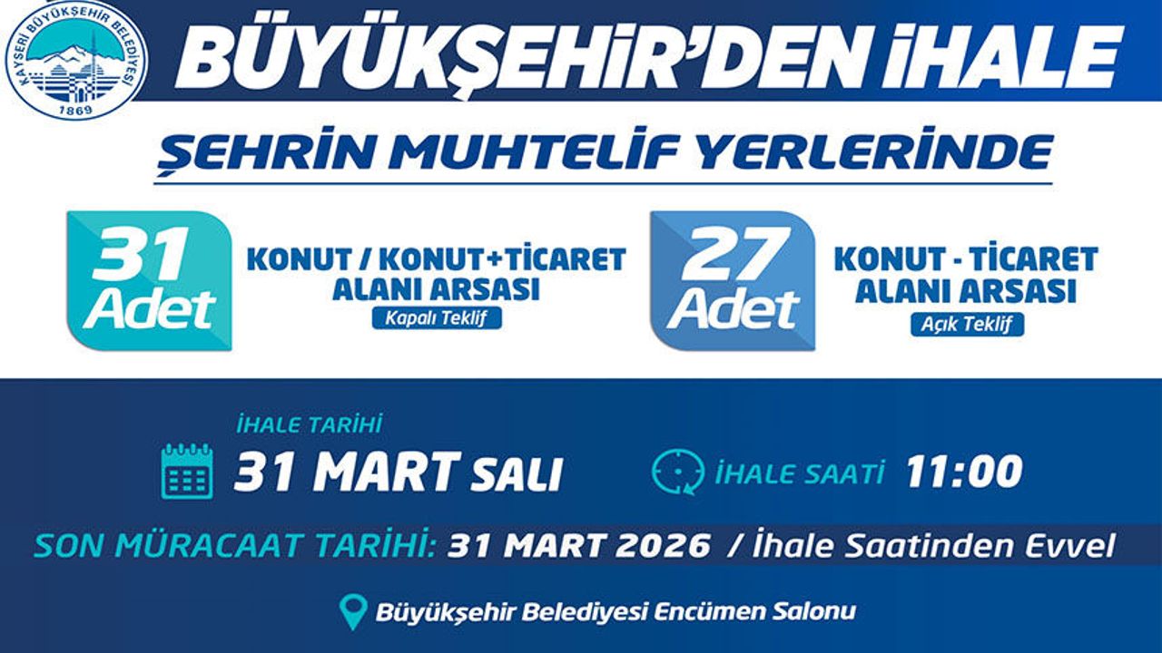 31 Mart 2026 Salı günü Büyükşehir Belediyesi Encümen Salonu'nda, 31 adet arsa ile diğer 27 adet arsanın satış ihalesi saat 11.00'de gerçekleşecek. Büyükşehir Belediyesi'nin ihalelerine son başvuru tarihi ihale saatinden evvel olarak belirlenirken, müracaatlar konusunda ise 27 adet arsa ihalesi başvurusu Büyükşehir Belediyesi Gelir Müdürlüğü'ne, 31 adet arsa ihalesi başvurusu da Büyükşehir Belediyesi Encümen Başkanlığı’nın (İhale Komisyonu) sekretarya görevini yapan Kararlar Şube Müdürlüğü kalemine yapılacak.