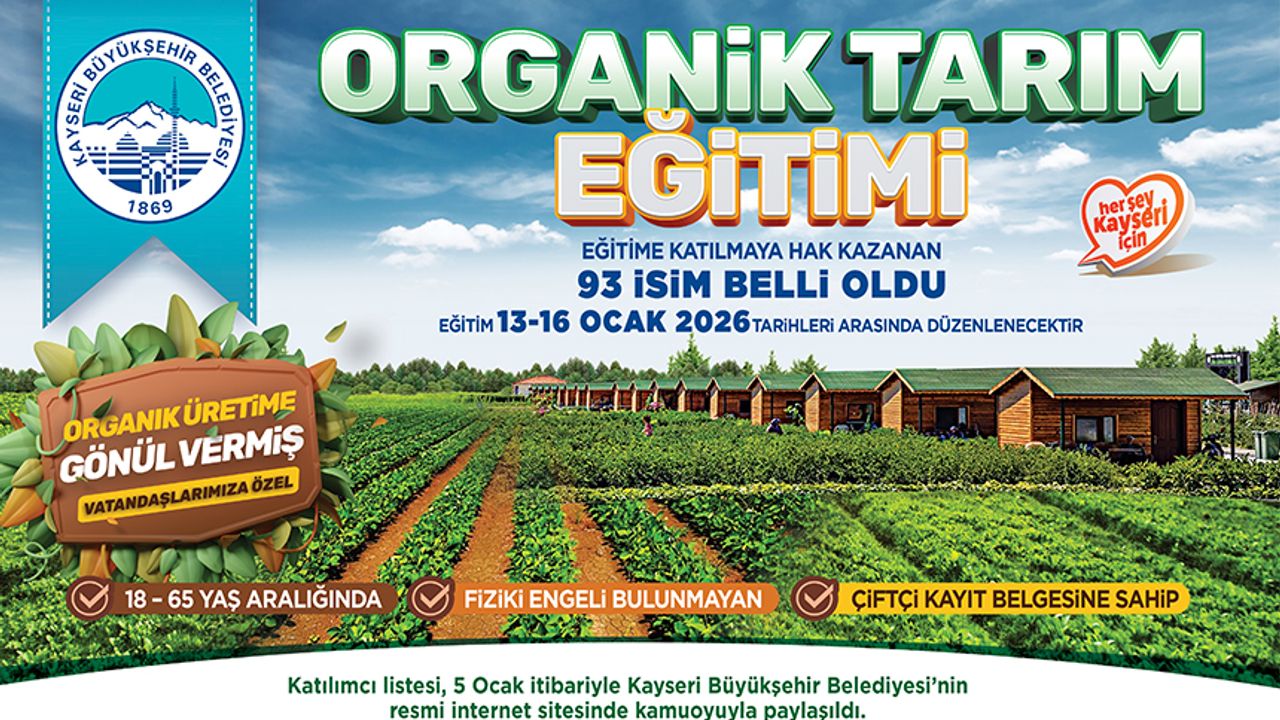 Kayseri Büyükşehir Belediyesi’nin 2026 sezonuna yönelik düzenlediği Organik Tarım Temel Eğitim Programı’na başvuran 108 kişi arasından eğitime katılmaya hak kazanan 93 isim belli oldu. Eğitimler 13 Ocak’ta başlayacak.