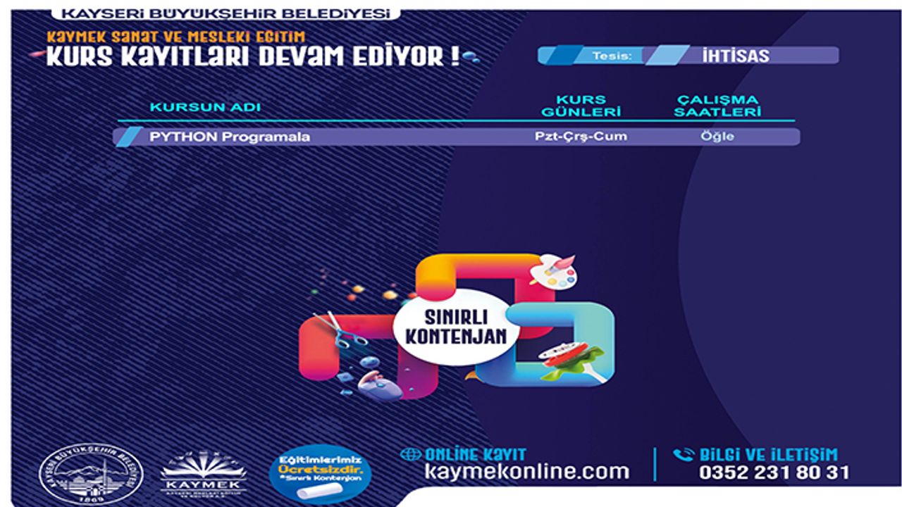 KAYMEK, teknoloji dünyasında güçlü bir adım atmak isteyen gençler için PYTHON Programlama Kursu imkânı sunuyor. Ücretsiz eğitim fırsatıyla, sınırlı kontenjanla sunulan kursa katılmak için kayıtlar devam ediyor.