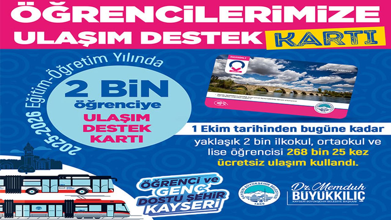 Kayseri Büyükşehir Belediye Başkanı Dr. Memduh Büyükkılıç’ın, ihtiyaç sahibi öğrencilere yönelik ulaşım kartı desteğinden yaklaşık 2 bin öğrenci faydalanırken, öğrenciler 3 aylık süreçte 268 bin kez ulaşımdan ücretsiz faydalandı.