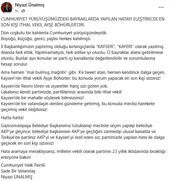 Cumhuriyet Halk Partili Niyazi Ünalmış da Milletvekili Böhürler’e tepki göstererek: “Dün coşkulu bir katılımla Cumhuriyet yürüyüşündeydik. Büyüğü, küçüğü, genci, yaşlısı herkes katılmıştı. İl Başkanlığımızın yaptırmış olduğu kırlangıçlarda “Kayseri”, “Kayeri” olarak yazılmış. Alanda fark ettik. Yapılmamalıydı, fark edilse iyi olurdu. O bayraklar alana getirilmese olurdu. Bunlar ayrı konular ve parti içi kanallarda değerlendirilir ve sorumlularına hesap sorulur. Ama hemen “mal bulmuş mağribi” gibi X’e tweet atan, hemen kendince dalga geçen, Kayseri’nin ithal vekili Ayşe Böhürler; bu konuda yorum yapacak en son kişi sizsiniz. Kayseri’de Resmi tören ve ziyaretler hariç sizi gören yok. Lakabınız kendi partinizde, partilileriniz arasında bile ithal vekil. Kayseri’de bir mahalle söylesek bilmezsiniz. Kayseri’de bir vatandaşın derdini gündeme getirmiş, bu konuda meclisi harekete geçirmiş vekil değilsiniz. Hatta hatta; Gaziosmanpaşa Belediye Başkanımız tutuklanıp mecliste seçim yapılıp belediye AKP’ye geçince, belediye başkanının AKP’ye geçtiğini zannedip ulusal kanalda ve Türkiye’de partiniz AKP’yi ve Kayseri’yi rezil eden siz; partimizde yapılan hata ile dalga geçecek en son kişi sizsiniz. Hata aramaya meraklıysanız, milletin vekili olarak partinin 23 yıllık iktidarında bıraktığı erezyona bakın” şeklinde konuştu.
