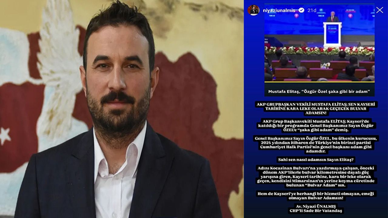 CHP’li Niyazi Ünalmış, “AKP Grup Başkanvekili Mustafa Elitaş, Kayseri’de katıldığı bir programda Genel Başkanımız Sayın Özgür Özel’e “şaka gibi adam” demiş. AKP Grup Başkanvekili Mustafa Elitaş; sen Kayseri tarihine kara leke olarak geçecek bulvar adamsın!” dedi.