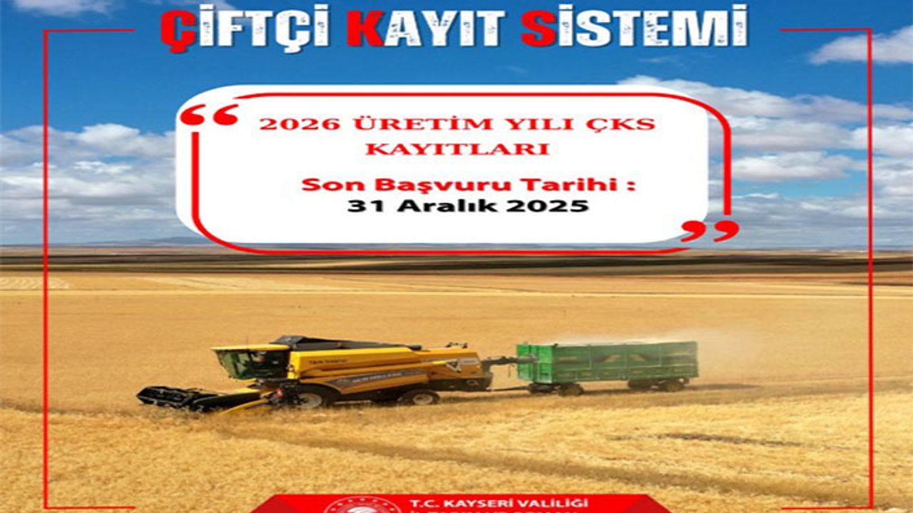 Kayseri İl Tarım ve Orman Müdürlüğü duyurdu: Çiftçi Kayıt Sistemi (ÇKS) başvuruları 31 Aralık 2025 tarihi mesai saati bitiminde sona erecek.