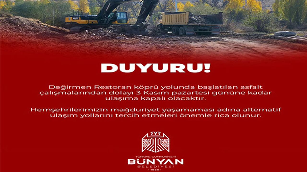 Bünyan Belediyesi tarafından yapılan çalışmalar neticesinde, Değirmen Restoran Köprü Yolu’nda başlatılan asfalt çalışmaları nedeniyle yolun 3 Kasım Pazartesi gününe kadar ulaşıma kapalı olacağı bildirildi. Yapılan açıklamada, “Hemşehrilerimizin mağduriyet yaşamaması adına alternatif ulaşım yollarını tercih etmeleri önemle rica olunur” denildi.