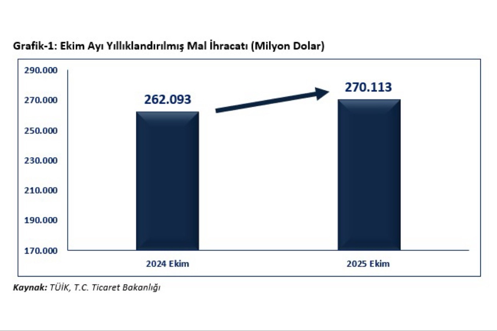 Ekim ayı ihracat/ithalat rakamlarını değerlendiren Ticaret Bakanı Ömer Bolat, “Ekim ayında ihracat 23 milyar 941 milyon dolara çıkarak en yüksek Ekim ayı ihracatı gerçekleşti. 2025 Ekim ayı itibari ile yıllıklandırılmış ihracatımız bir önceki yılın aynı ayına göre 8,0 milyar dolar artarak 270,1 milyar dolara ulaşmıştır” dedi.