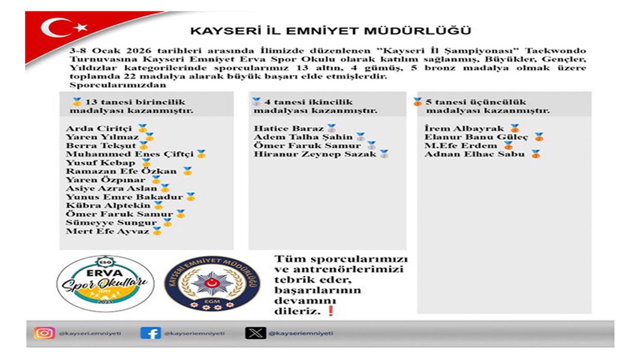 Kayseri’de 3–8 Ocak 2026 tarihleri arasında düzenlenen Kayseri İl Şampiyonası Taekwondo Turnuvasına katılan Kayseri Emniyet ERVA Spor Okulu sporcuları 13 Altın, 4 Gümüş, 5 Bronz
