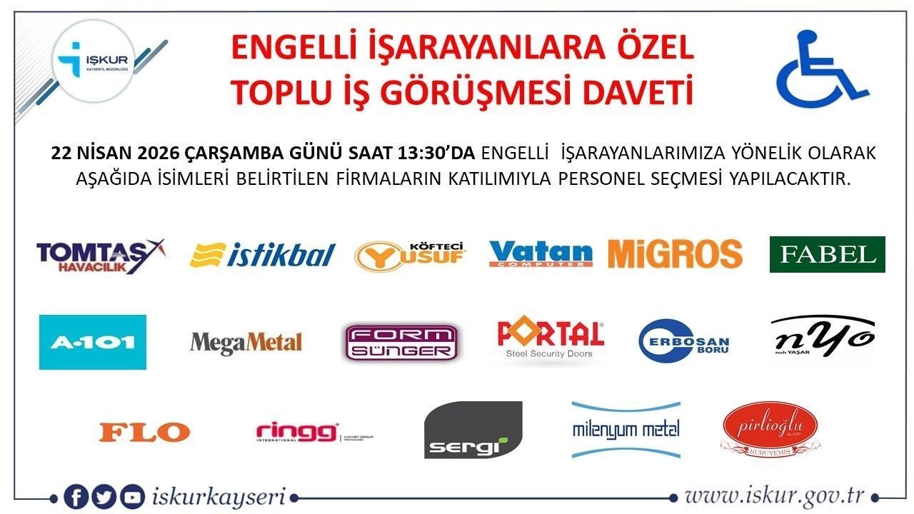 Kayseri’de 17 firmanın katılımıyla 28 kişilik engelli iş arayan eleman için toplu iş görüşmesi 22 Nisan 2026 Çarşamba günü saat 13:30’da Kayseri Çalışma ve İş Kurumu İl Müdürlüğü’nde gerçekleştirilecek.Bu kapsamda montaj işçisi, satış danışmanı, temizlik görevlisi, market elemanı, montaj-döşemeci, beden işçisi, mobilya-döşemeci, reyon görevlisi ve meydancı gibi birçok kategoride eleman alınacak.