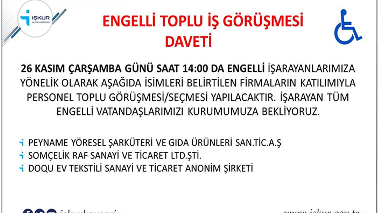İŞKUR Kayseri tarafından engelli vatandaşlara yönelik belirlenen firmalar için toplu görüşme yapılacağı duyuruldu. Program 26 Kasım Çarşamba Günü saat 14:00’de gerçekleşecek.