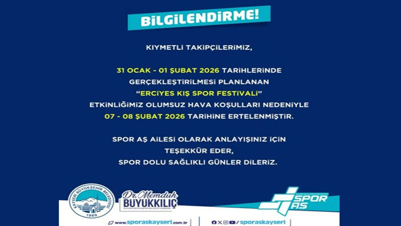 Erciyes'te 31 Ocak-1 Şubat tarihlerinde yapılması planlanan Erciyes Kış Spor Festivali, olumsuz hava koşulları nedeniyle ertelendiği açıklandı. Spor A.Ş. tarafından yapılan açıklamada, etkinliğin 7–8 Şubat tarihlerinde gerçekleştirileceği bildirildi. Açıklamada, hava şartlarının etkinliğin sağlıklı ve güvenli şekilde yapılmasına elverişli olmaması nedeniyle erteleme kararı alındığı ifade edildi.