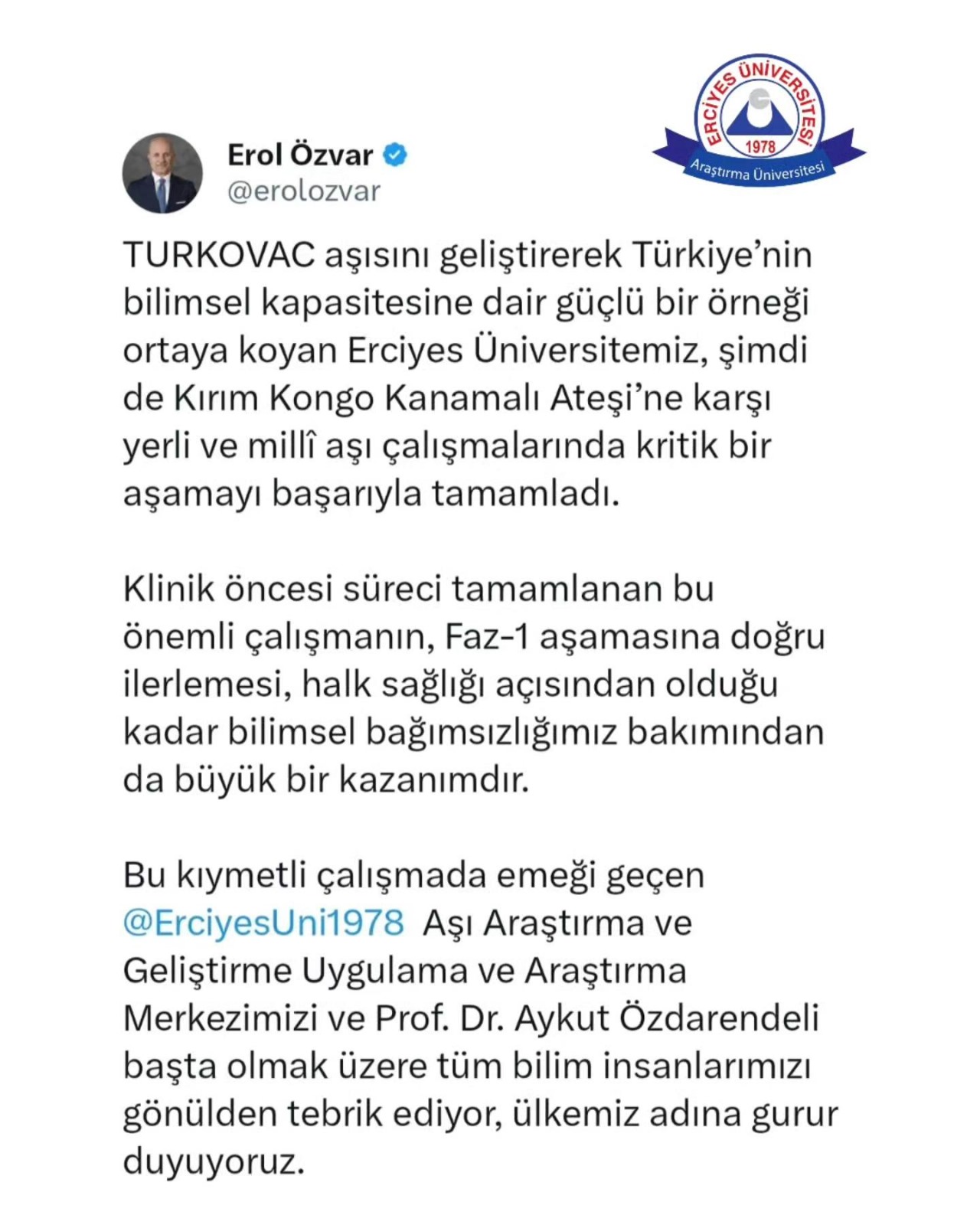 Konuya ilişkin Erciyes Üniversitesi’nden yapılan açıklamada ise “YÖK Başkanımız Prof. Dr. Erol Özvar’ın paylaşımında ifade ettiği üzere, Erciyes Üniversitesi KKKA’ya karşı yerli aşı geliştirme çalışmalarında Faz-1 aşamasına doğru önemli bir ilerleme kaydetmiştir. Bu süreçte başta Prof. Dr. Aykut Özdarendeli olmak üzere emeği geçen tüm bilim insanlarımıza teşekkür eder; Erciyes Üniversitesi’nin yenilikçi araştırmalarla ülkemizin sağlık bilimlerine katkı sunmaya devam ettiğini kamuoyuna arz ederiz” ifadelerine yer verildi.