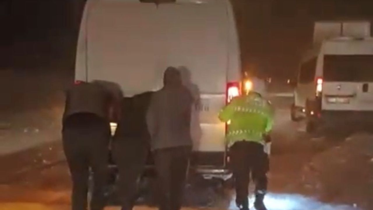 Kayseri ve çevresinde etkili olan kuvvetli yağış sonrası, Gürün yolu üzeri Örenşehir mevkiinde yolda kalan araçlara polis ekipleri yardım etti.