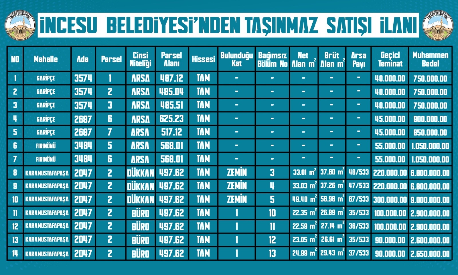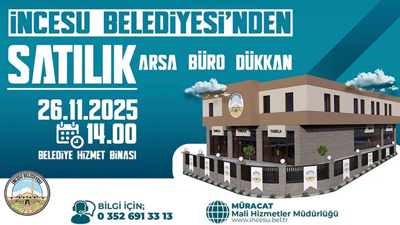 İncesu Belediyesi mülkiyetinde bulunan arsa, dükkan ve büro niteliği taşıyan 14 taşınmaz ihale ile satışa çıkarıyor.