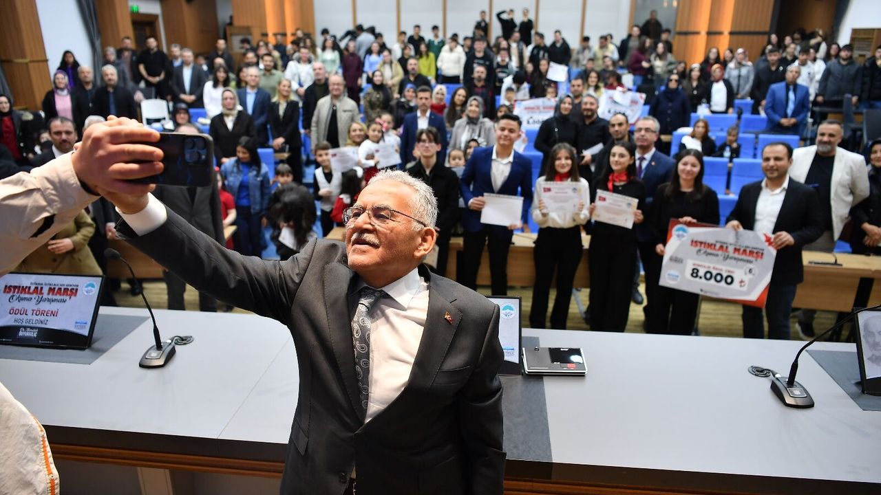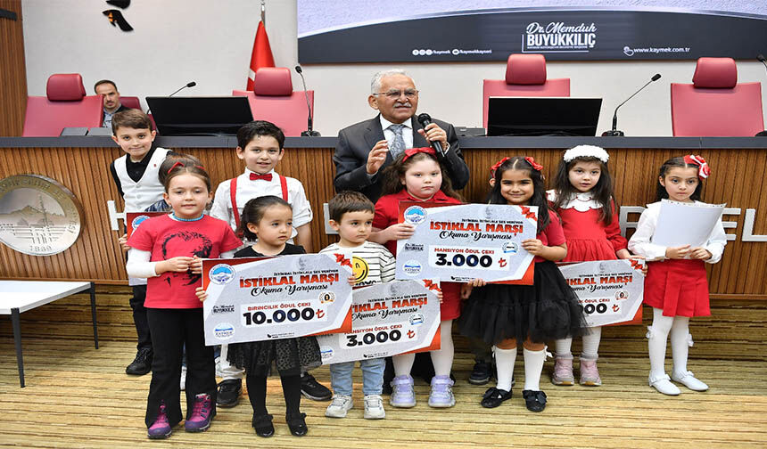 Büyükşehir Belediyesi Kayseri Mesleki Eğitim ve Kültür A.Ş. (KAYMEK) tarafından 12 Mart İstiklal Marşı’nın kabulünün 105’inci yılı dolayısıyla düzenlenen ‘İstikbal İstiklale Ses Veriyor’ İstiklal Marşı Okuma Yarışması’nda ödüller sahiplerini bulurken, dereceye girenlere ödüllerini Başkan Büyükkılıç takdim etti. Büyükşehir Belediyesi Meclis Salonu’nda gerçekleşen ‘İstikbal İstiklale Ses Veriyor’ İstiklal Marşı Okuma Yarışması Ödül Töreni’ne Başkan Büyükkılıç’ın yanı sıra, Büyükşehir Belediyesi Genel Sekreter Yardımcısı Fatih Temeltaş, daire başkanları ile öğrenciler ve aileleri katıldı.
