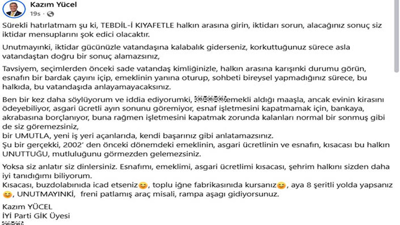 Vatandaşın geçinemediğini ifade eden İYİ Parti GİK Üyesi Kazım Yücel, “Sürekli hatırlatmam şu ki, tebdil-i kıyafetle halkın arasına girin, iktidarı sorun, alacağınız sonuç siz iktidar mensuplarını şok edici olacaktır. Unutmayın ki, iktidar gücünüzle vatandaşına kalabalık giderseniz, korkuttuğunuz sürece asla vatandaştan doğru bir sonuç alamazsınız, Tavsiyem, seçimlerden önceki sade vatandaş kimliğinizle, halkın arasına karışınki durumu görün, esnafın bir bardak çayını içip, emeklinin yanına oturup, sohbeti bireysel yapmadığınız sürece, bu halkı da, bu vatandaşı da anlayamayacaksınız” dedi.