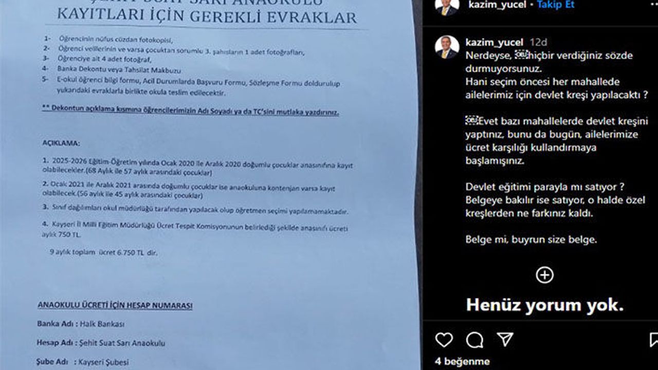 İYİ Parti GİK Üyesi Kazım Yücel, sosyal medya hesabından yapmış olduğu açıklamada; “Hani seçim öncesi her mahallede ailelerimiz için devlet kreşi yapılacaktı? Evet bazı mahallelerde devlet kreşini yaptınız, bunu da bugün, ailelerimize ücret karşılığı kullandırmaya başlamışınız. Devlet eğitimi parayla mı satıyor? Belgeye bakılır ise satıyor, o halde özel kreşlerden ne farkınız kaldı. Belge mi, buyrun size belge” dedi.