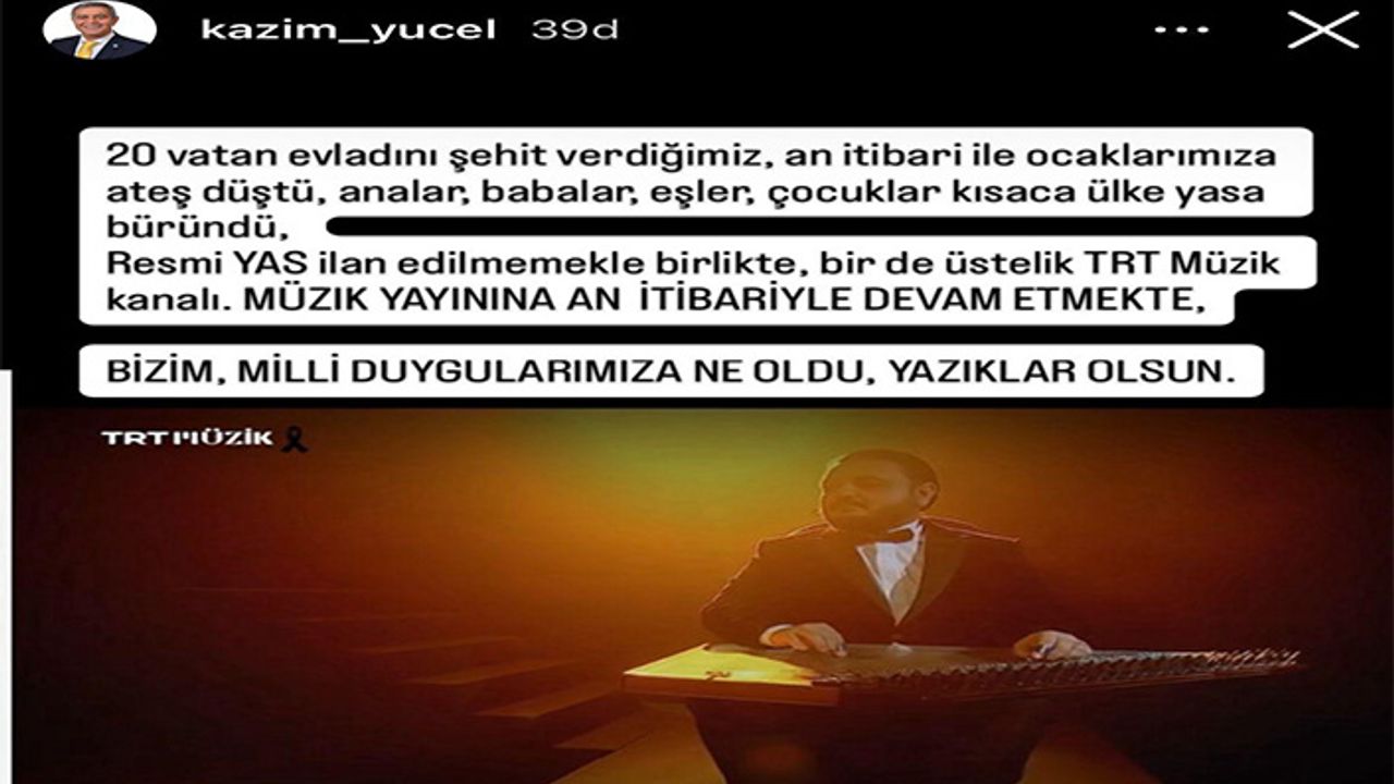 İYİ Parti GİK Üyesi Kazım Yücel, TRT müzik kanalının Türkiye’nin 20 şehit verdiği halde yayına devam ettiğini belirterek tepki gösterdi. Yücel: “TRT Müzik kanalı müzik yayınına an itibariyle devam etmekte. bizim milli duygularımıza ne oldu yazıklar olsun” dedi.
