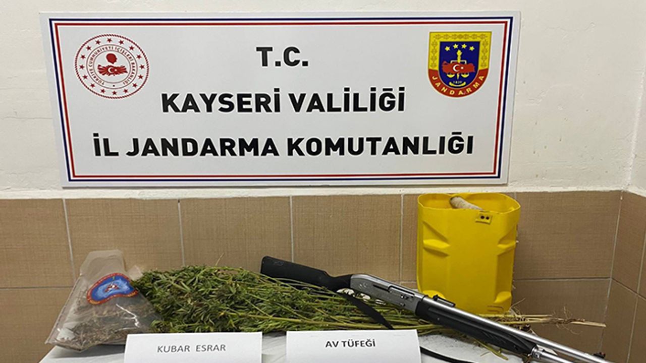 Kayseri İl Jandarma Komutanlığı İstihbarat Şube Müdürlüğü ve Özvatan İlçe Jandarma Komutanlığınca yapılan çalışmalarda; A.K. isimli şahsın yasadışı kenevir ekimi yaptığı bilgisi elde edilmesi üzerine yapılan aramada bin 690 gram Kubar Esrar, 1 adet ruhsatsız av tüfeği ele geçirildi.