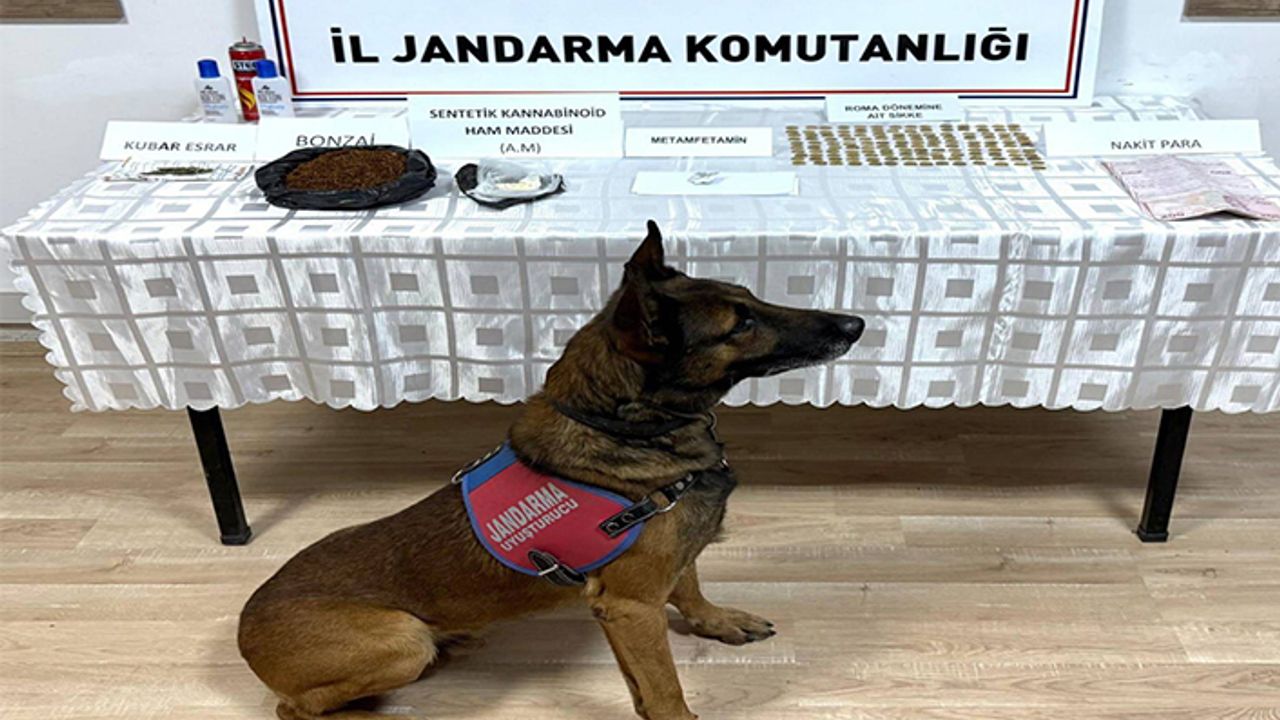Kayseri İl Jandarma Komutanlığı ve Narkotik Suçlarla Mücadele Şube Müdürlüğü ekiplerince, Kocasinan ilçesi Zümrüt Mahallesi’nde D.G. isimli şahsın ikametinde ve bahçesinde yapılan aramalarda; 300 gram bonzai, 4 gram kubar esrar, 9 gram A.M. maddesi (yaklaşık 900 gram bonzai sentetik kannabinoid elde edilebilecek), 1 gram metamfetamin, 2 adet 130 ml aseton (uyuşturucu imalatında kullanılan), 141 adet tarihi sikke ve suçtan elde edildiği değerlendirilen 13 bin 800 lira ele geçirildi.