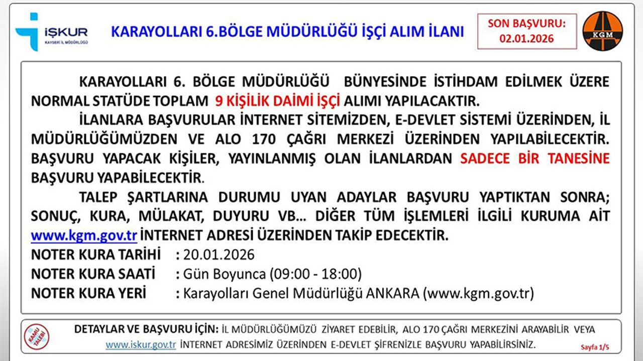İŞKUR, Karayolları 6. Bölge Müdürlüğü’ne 9 kişilik daimi işçi alınacağını duyurdu. Bu kapsamda 1 aşçı, 8 silahlı özel güvenlik görevlisi alınacağı bildirildi. Kura ise 20 ocak 2026’da gerçekleştirilecek.