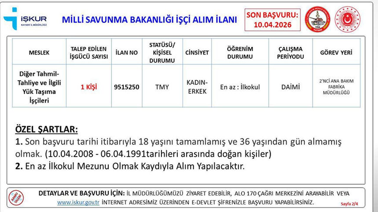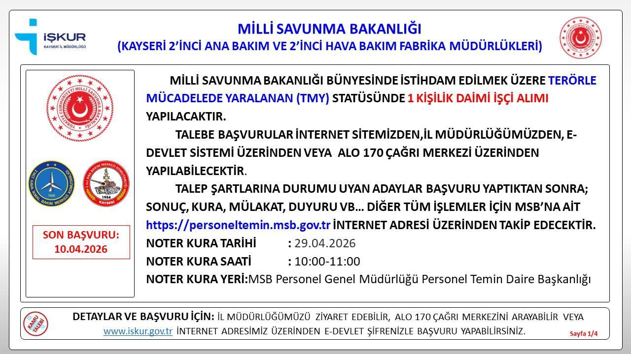 İŞKUR Kayseri tarafından Milli Savunma Bakanlığı bünyesinde Kayseri 2’nci Ana Bakım Fabrika Müdürlüğü’ne terörle mücadelede yaralanan (TMY) statüsünde 1 kişilik daimi işçi alımı yapılacağını duyuruldu.