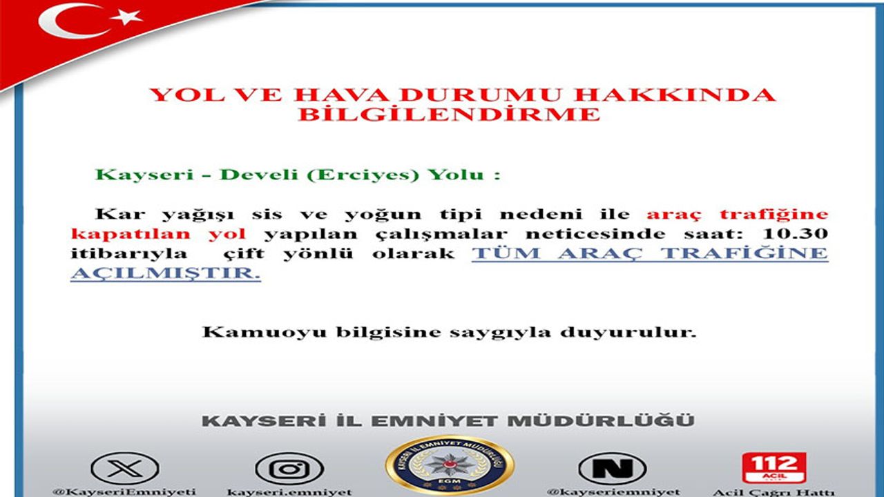 Kayseri İl Emniyet Müdürlüğü Trafik Denetleme Şube Müdürlüğü'nün hava ve yol durumu hakkında yapmış olduğu bilgilendirmelere göre; Kar yağışı, sis ve yoğun tipi nedeniyle araç trafiğine kapatılan Kayseri-Develi yolu, yapılan çalışmalar neticesinde saat 10.30 itibarıyla çift yönlü olarak tüm araç trafiğine açıldı.