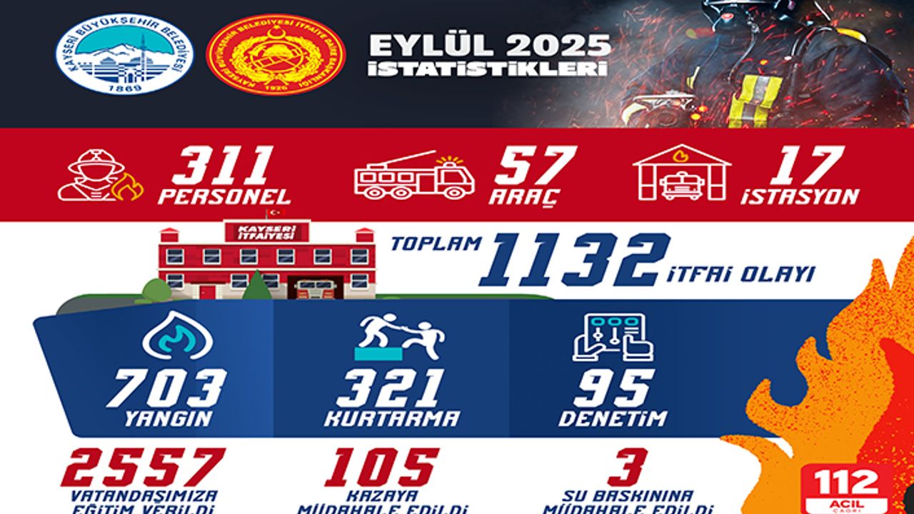 Kayseri Büyükşehir Belediyesi’nin 17 istasyon, 57 araç ve 311 personelden oluşan itfaiye teşkilatı, Eylül ayı boyunca 703 yangın, 321 kurtarma, 105 trafik kazası ve 3 su baskınına başarılı bir şekilde müdahale ederek toplamda bin 132 itfai olayda hızlı ve etkin bir şekilde görev aldı.