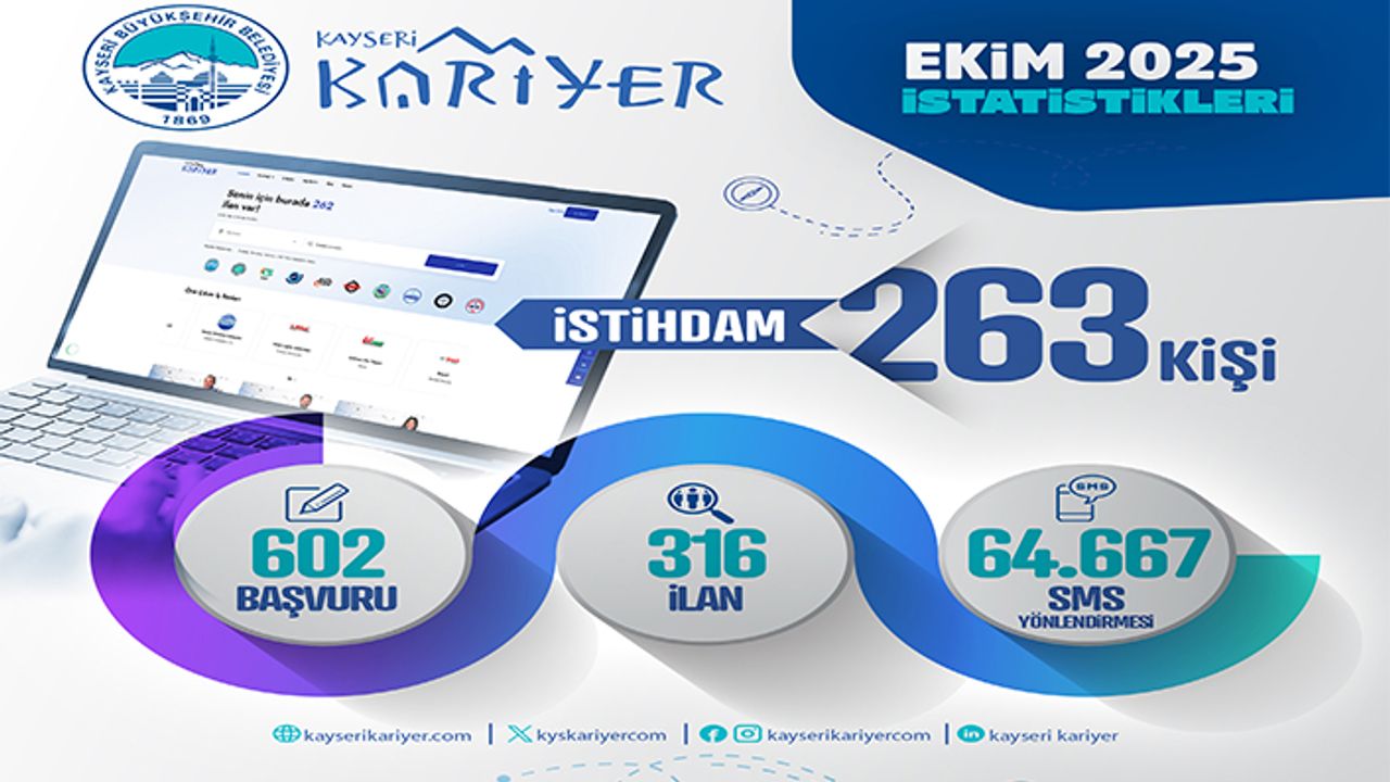 Bu kapsamda Kayseri Kariyer Merkezi, 2025 yılı Ekim ayında toplam 263 kişinin istihdamına aracılık ederek vatandaşların yaşamına dokundu. Öte yandan söz konusu 1 aylık süreçte 64 bin 667 SMS yönlendirmesi yapılan faaliyetlerde 602 başvuru, 316 ilan işleme alındı, talep edilen işçi sayısı ise 726 olarak gerçekleşti.