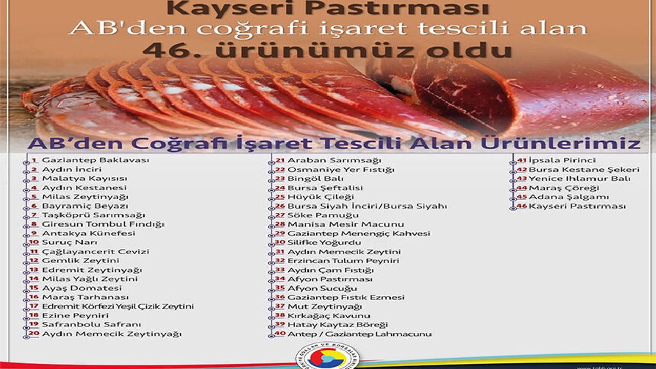 Türkiye Odalar ve Borsalar Birliği (TOBB) Başkanı Rifat Hisarcıklıoğlu, Kayseri pastırmasının Avrupa Birliği’nden coğrafi işaret tescili aldığını duyurdu.