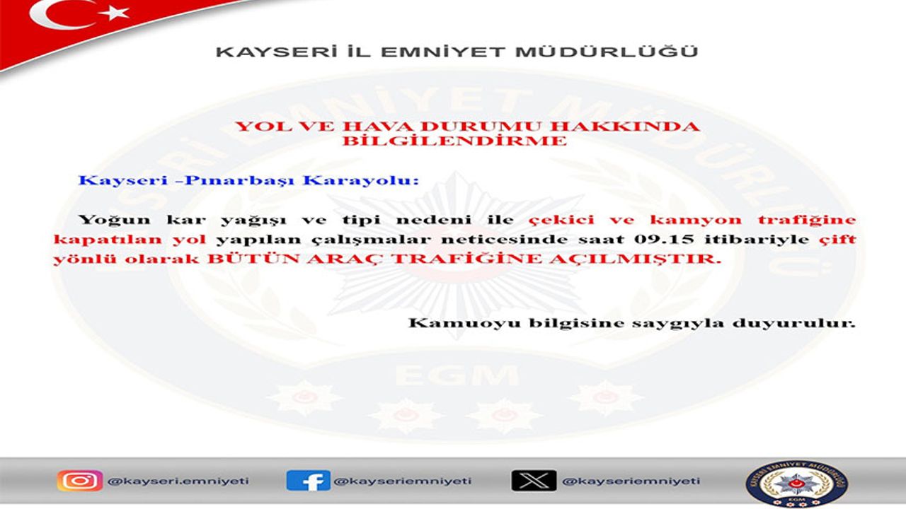 Kayseri İl Emniyet Müdürlüğü Bölge Trafik Denetleme Şube Müdürlüğü ekiplerince yol kontrolleri gerçekleştiriliyor. Bu kapsamda emniyetin saat 09:15 itibariyle yapmış olduğu duyuruya göre; Kayseri-Pınarbaşı karayolunun çift yönlü olarak tüm araç trafiğine açıldığı bildirildi.