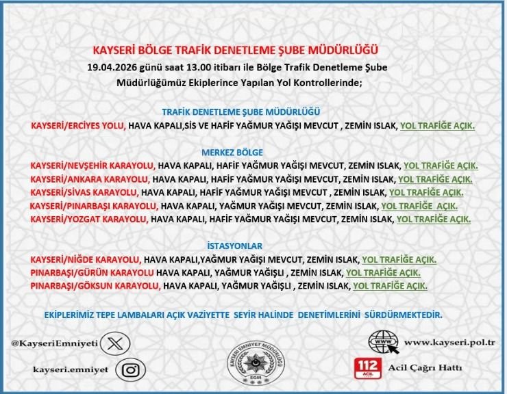 Kayseri İl Emniyet Müdürlüğü Bölge Trafik Denetleme Şube Müdürlüğü ekiplerinin 19.04.2026 günü saat 13:00’da hava ve yol durumu hakkında yapmış olduğu bilgilendirmelere göre;