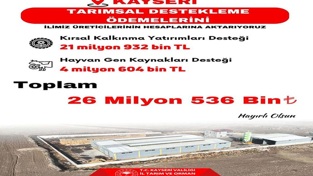 Kayseri Tarım ve Orman İl Müdürlüğü, Kırsal Kalkınma Yatırımları Desteği kapsamında 21 milyon 932 bin lira ve Hayvan Gen Kaynakları Desteği kapsamında 4 milyon 604 bin lira olmak üzere toplam 26 milyon 536 bin liralık ödemenin çiftçilerin hesaplarına aktarılacağını duyurdu. Yapılan açıklamada, “Desteklerimizle üreticimizin gücüne güç katıyor, emeğine sahip çıkıyoruz” denildi.