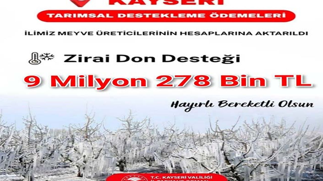 Kayseri İl Tarım ve Orman Müdürlüğü, üreticilere toplam 9 milyon 278 bin lira tutarında zirai don desteğinin aktarıldığını duyurdu.